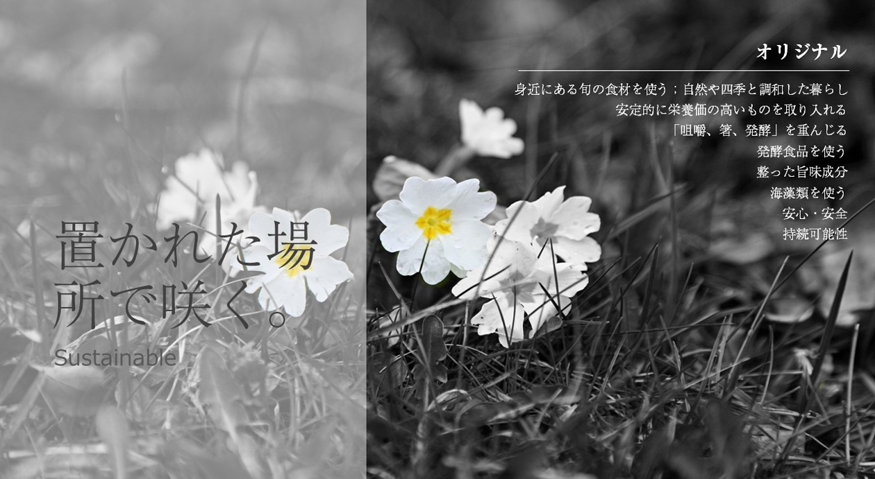 可能な限り自給自足をしています。発酵が日常。薬草、野生の果物、自然栽培の米や豆類を年がら年中発酵させています。古代黒米と糀菌と大豆と天日海塩があれば、天然菌の力を借りて、酵素玄米、納豆、味噌などおおよそのものは作れます。ローフードのクラスでも玄米甘酒を甘味料に使ったり、自然塩の代わりに塩麹、醤油麹、味噌などを用います。ナッツやシード類、メープルシロップなどはすべてオーガニックです。